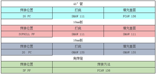 組合件包含管、10mm板、16mm板和角焊縫四個(gè)試件。焊接完成后進(jìn)行外觀(guān)檢查、折斷檢驗、射線(xiàn)探傷。四個(gè)試件的焊接方法和焊接位置在賽前從下表中抽取確定。